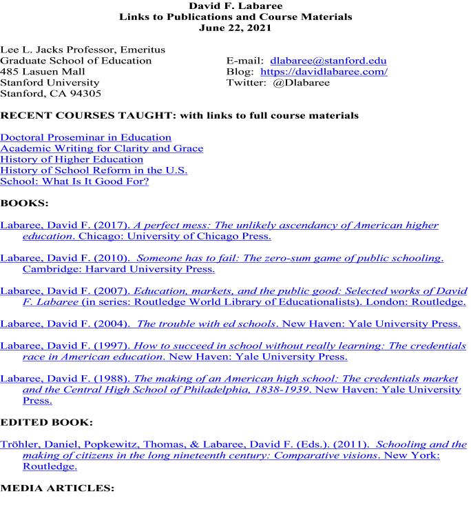This post is a set of links to all of my published papers, book chapters, and magazine articles and also to six course syllabi. Here's a link to a PDF of the entire list, which is more usable. Feel free to share with anyone you like. David F. Labaree Links to Publications and Course Materials … Continue reading Links to PDFs of All My Papers, Chapters, and Articles