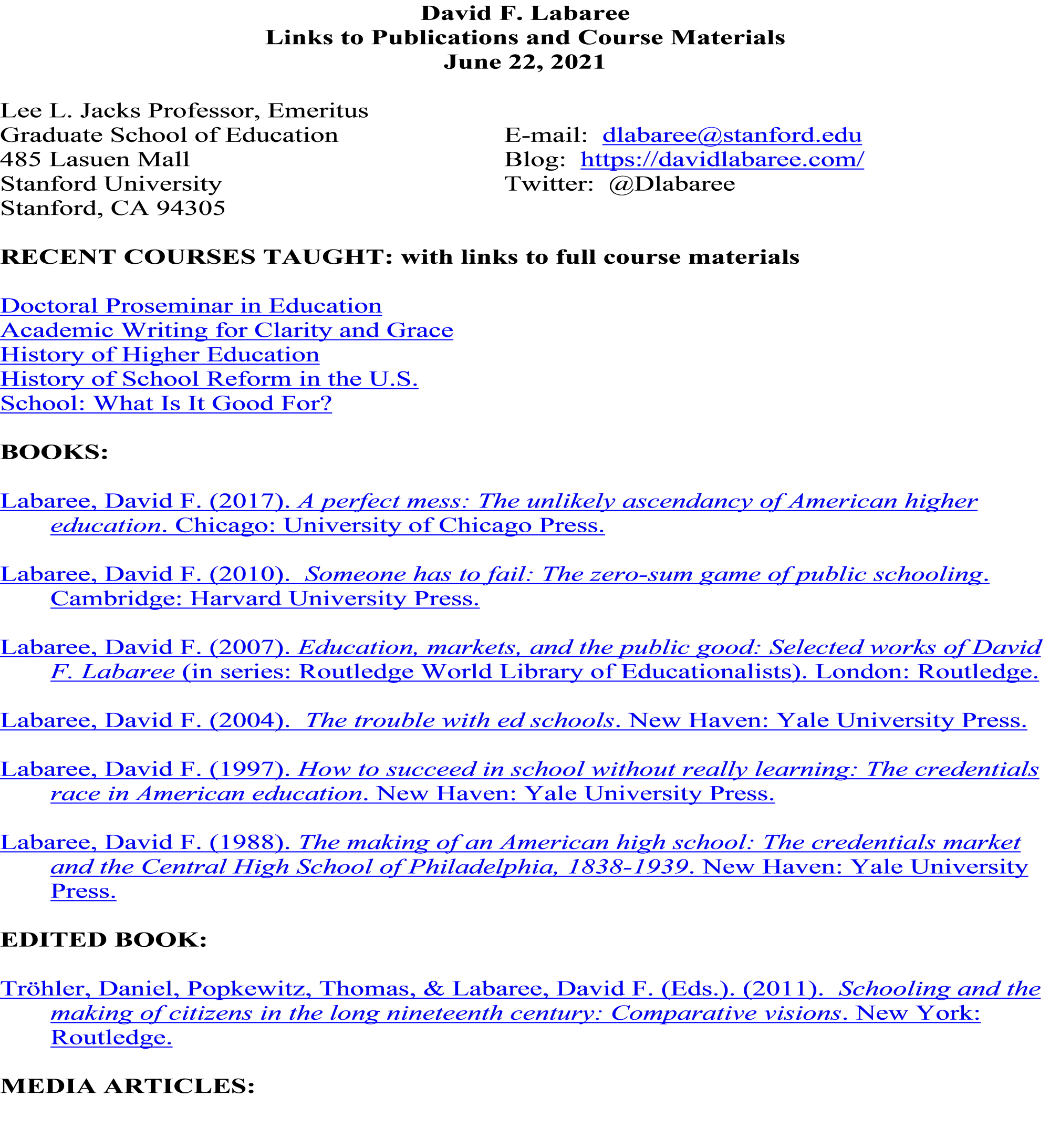 Labaree, David F. (2008). Limits on the impact of educational reform: The case of progressivism and U.S. schools, 1900-1950.  In Claudia Crotti & Fritz Osterwalder (Eds.), Das Jahrhundert der Schulreformen: Internationale und nationale Perspektiven, 1900-1950 (pp. 105-133). Berne: Haupt.