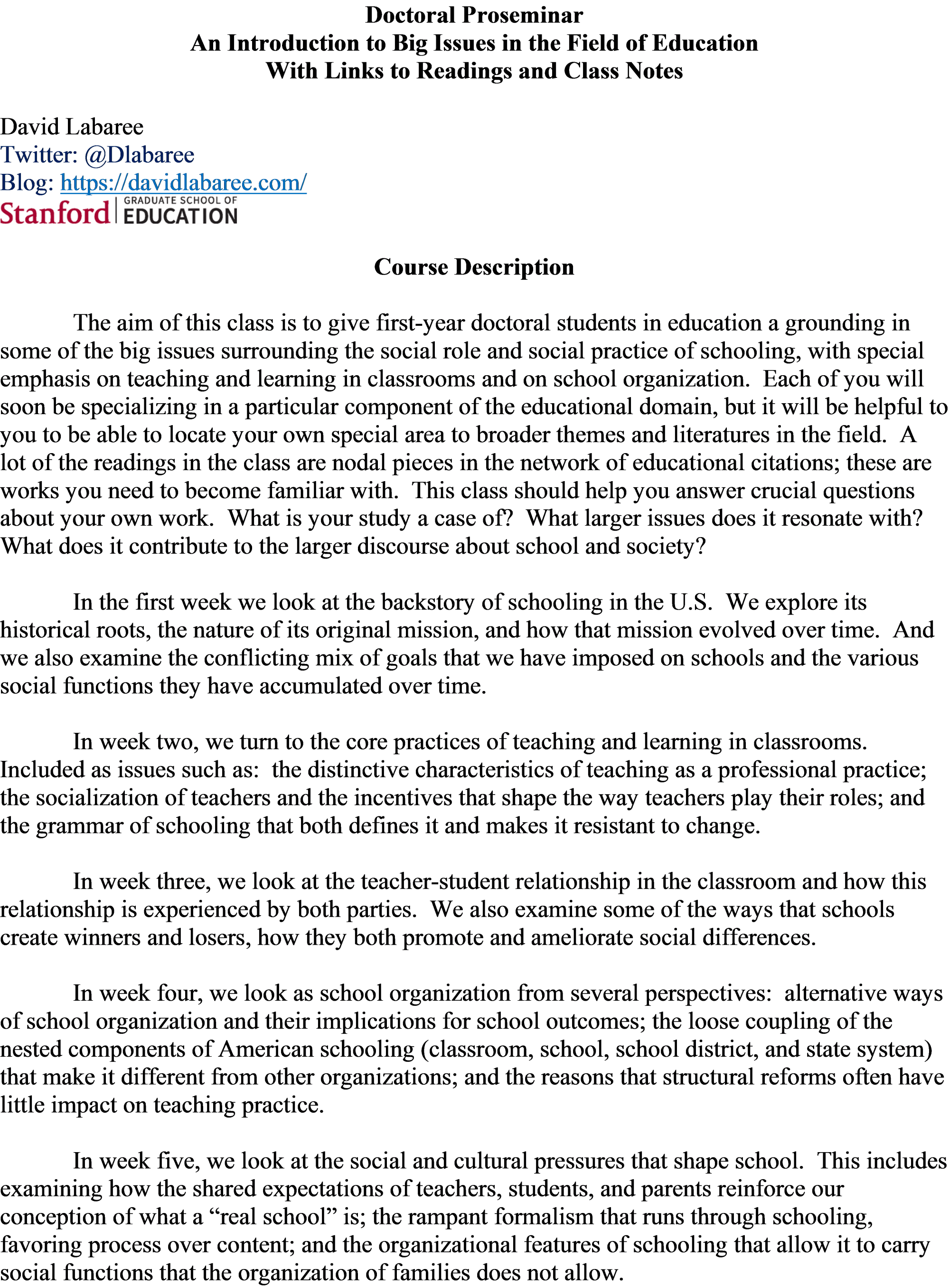 This post contains all of the material for the doctoral proseminar — Introduction to Big Issues in the Field of Education — that I taught at the Stanford Graduate School of Education for the last four years of my time there.