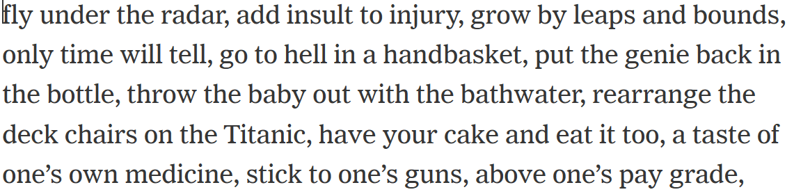 Ramped up, amped up, ratchet up, gin up, up the ante, double down, jump-start, be behind the curve, swim against the tide, go south, go belly up, level the playing field, open the floodgates, think outside the box, push the edge of the envelope, pull out all the stops, take the foot off the pedal, pump the brakes, grease the wheel, circle the wagons, charge full steam ahead, pass with flying colors, move the goal posts, pour gasoline on, add fuel to the fire, fly under the radar, add insult to injury, grow by leaps and bounds, only time will tell, go to hell in a handbasket, put the genie back in the bottle, throw the baby out with the bathwater, rearrange the deck chairs on the Titanic, have your cake and eat it too, a taste of one’s own medicine, stick to one’s guns, above one’s pay grade, punch above one’s weight, lick one’s wounds, pack a punch, roll with the punches, come apart at the seams, throw a wrench into, caught in the cross hairs, cross the Rubicon, tempt fate, go ballistic, on tenterhooks, hit the nail on the head, a nail in the coffin, joined at the hip, welcome with open arms, rub shoulders with, shoot oneself in the foot, dip one’s toes into, have a leg up, dance to the tune of, the next shoe to drop, in the DNA of, the gold standard, a gold mine, land mines, a run for the money, money to burn, penny-wise and pound-foolish, lap of luxury, off the charts, over a barrel, late to the party, it takes two to tango, behind the eight ball, pride of place, final straw, full throttle, no holds barred, red flag, silver lining, on a silver platter, in the rearview mirror, bargain basement, silos, morph, meme, trope, mind meld, warp speed, inner demons, have skin in the game, game changer, change agent, strong suit, ground game, ground zero, inflection point, tipping point, playbook, page turner, singing from the same hymnal, singing a new tune, straight out of central casting, the devil’s in the details, take the bull by the horns, the canary in the coal mine, chickens coming home to roost, beat a dead horse, pony up, the straw that broke the camel’s back, open a can of worms, buy a pig in a poke, cash cow, rabbit hole, dog days, dog whistle, bells and whistles, tool kit, third rail, the tip of the iceberg, the light at the end of the tunnel, the arc of history, speak truth to power, break the glass ceiling, the writing’s on the wall, between a rock and a hard place, beyond the pale, take the wind out of the sails of, that ship has sailed, sinking ship, tidal wave, roller-coaster ride, gravy train, tanked, cratered, Rubik’s Cube, Rosetta Stone, Rolodex, poster child, problem child, rock star, pundit, national treasure, charter member, heavy hitter, heavy lifting, political football, throw a Hail Mary, full-court press, hit a home run, play with house money, laser-focused, secret sauce, red meat, piece of cake, bread and butter, cherry-pick, low-hanging fruit, sticker shock, kick-start, kick into overdrive, kick the tires, kick the can down the road, where the rubber meets the road, an albatross around the neck, a feather in the cap, long in the tooth, armed to the teeth, cut one’s teeth, rib tickler, spine tingling, pull the wool over the eyes of, pull the plug on, pull the trigger, loosen the reins, sweep under the carpet, throw under the bus, throw for a loop, read the riot act, lead the pack, the short end of the stick, at the drop of a hat, the jury is still out, hung out to dry, as if that weren’t enough, it would be an understatement to say, it would be no exaggeration to say, despite or perhaps because of, what goes around comes around, for all intents and purposes, make a long story short, the fact of the matter, to be sure, truth be told, a who’s who, famously, arguably, literally, zeitgeist, mantra, optics, granular, narrative, interrogate, paradigm, venue, robust, compelling, fever pitch, pitch perfect, picture perfect, perfect storm, take by storm, eye of the storm, back burner, petri dish, echo chamber, hot button, hard wire, go viral, bingeable, blockbuster, on steroids, testosterone-laced, metastasize, contextualize, preternaturally, outsize, gobsmacked, turbocharged, weaponized, apocalyptic, existential …