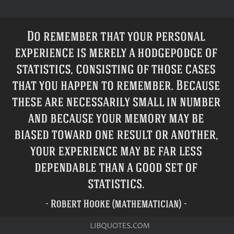 His argument in this essay is that we desperately need statistics to offset the biases that are built into our personal experience, which exposes us to only a minuscule sliver of the world around us. To say “in my lived experience” is not to say much at all. Worse, it suggests that what I have seen in my limited time and place trumps all other forms of knowledge about life and living.